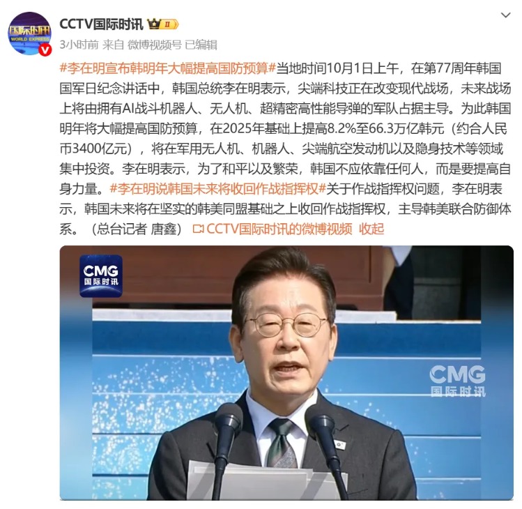 当地时间10月1日上午,在第77周年韩国国军日纪念讲话中,韩国总统李在明表示,尖端科技正在改变现代战场,未来战场上将由拥有AI战斗机器人、无人机、超精密高性能导弹的军队占据主导。为此韩国明年将大幅提高国防预算,在2025年基础上提高8.2%至66.3万亿韩元(约合人民币3400亿元),将在军用无人机、机器人、尖端航空发动机以及隐身技术等领域集中投资。李在明表示,为了和平以及繁荣,韩国不应依靠任何人,而是要提高自身力量。