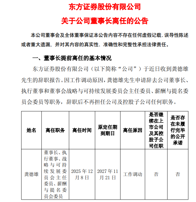 12月8日晚间,东方证券发布公告称,公司于近日收到龚德雄的辞职报告。因工作调动原因,龚德雄申请辞去公司董事长、执行董事和董事会战略与可持续发展委员会主任委员、薪酬与提名委员会委员等职务,辞职后不再担任公司及控股子公司任何职务。公告显示,龚德雄的原定任期到期日,为2027年11月21日。值得一提的是,11月14日,“上海发布”微信公众号发布的《上海市市管干部任职前公示》显示,现任申能(集团)有限公司副总经理的龚德雄,拟提名任市管企业经理班子正职。公示时...
