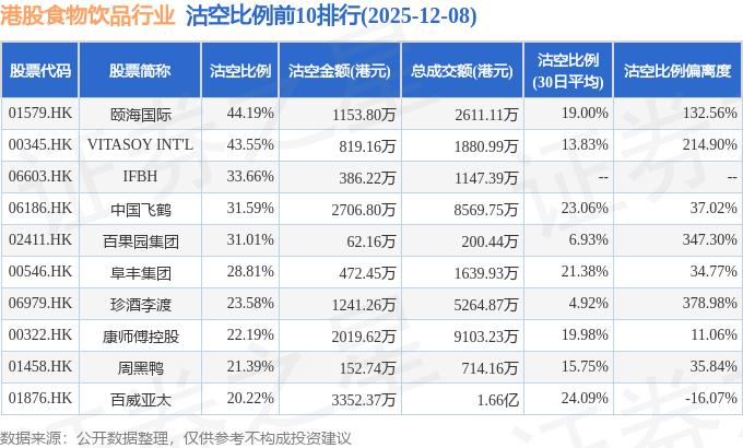 从沽空比例来看,颐海国际、VITASOY INT'L、IFBH沽空比例位居行业前三,分别为44.19%、43.55%、33.66%。