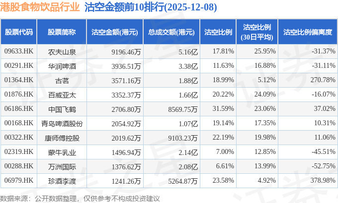 从沽空金额来看,农夫山泉、华润啤酒、古茗沽空金额位居行业前三,分别为9196.46万港元、3936.51万港元、3571.16万港元。