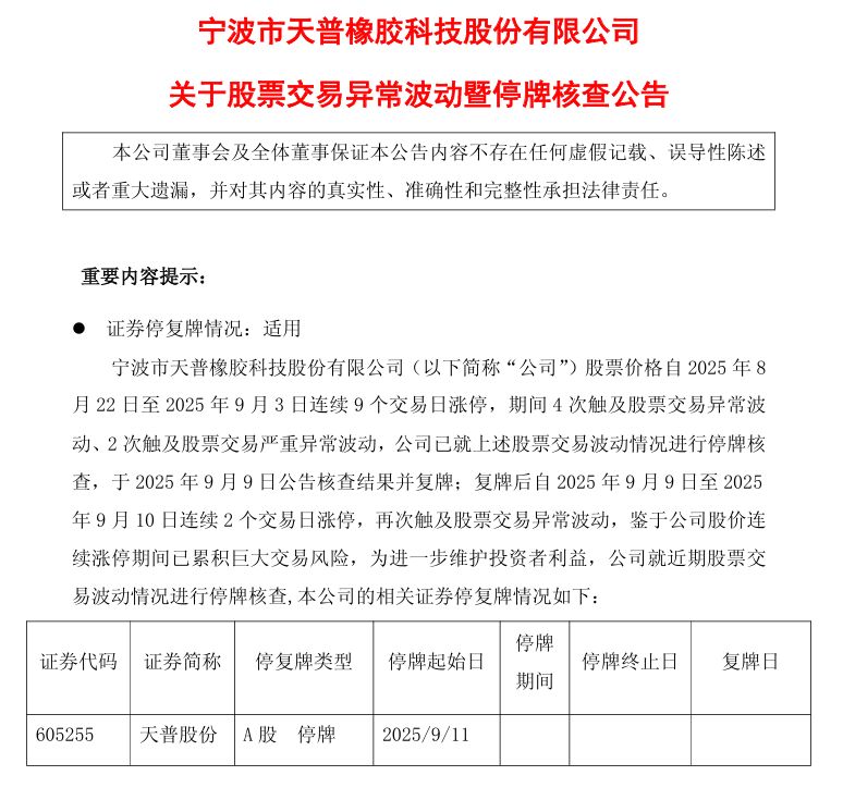 9月10日,天普股份(605255.SH)公告称,公司股价连续11个交易日涨停,期间已累积巨大交易风险,现已严重偏离上市公司基本面,存在随时快速下跌的风险。 公司股票价格自2025年8月22日至2025年9月10日连续11个交易日涨停,累计上涨185.29%,期间已累积巨大交易风险,目前公司股价已严重偏离上市公司基本面,存在随时快速下跌的风险。敬请广大投资者注意二级市场交易风险。 为维护投资者利益,公司将就上述股票交易波动情况进...