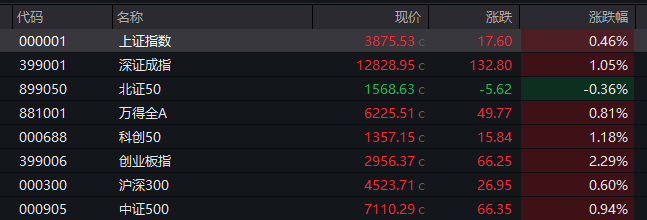 A股今日(9月1日)延续上扬态势,创业板指涨超2%,续创阶段新高;港股走势强劲,两大股指双双涨超2%。 具体来看,三大股指盘中震荡上扬,深证成指、创业板指均创逾3年新高。截至收盘,沪指涨0.46%报3875.53点,深证成指涨约1%报12828.95点,创业板指涨2.29%报2956.37点,科创50指数涨1.18%,沪深北三市合计成交27779亿元。 场内超3200股飘红,保险、券商、银行板块集体下挫;黄金概念爆发,中...