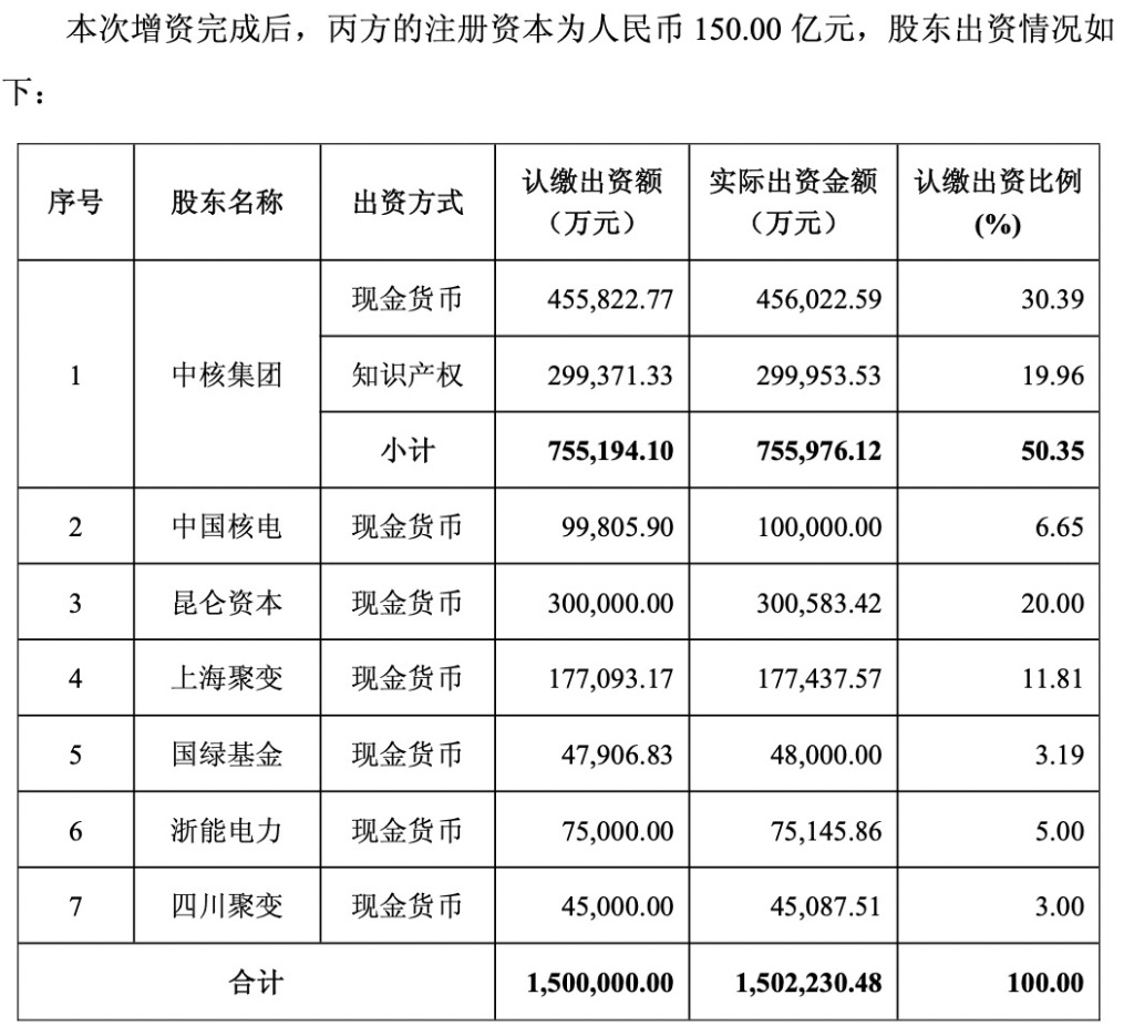 中国核电(601985.SH)7月22日晚间公告,为响应国家未来产业战略发展要求,落实中国核能“三步走”战略,拟参股投资中国聚变能源有限公司(下称中国聚变能源公司)。公告显示,中国聚变能源公司目前为中核集团全资子公司,本次交易将由中核集团、中国核电、昆仑资本、上海聚变、国绿基金、浙能电力及四川聚变以1.0019元/注册资本的价格共同向中国聚变能源公司投资约1149157.48万元,认购后者新增注册资本1146927.00万元。增资完成后,中国聚变能源公司...