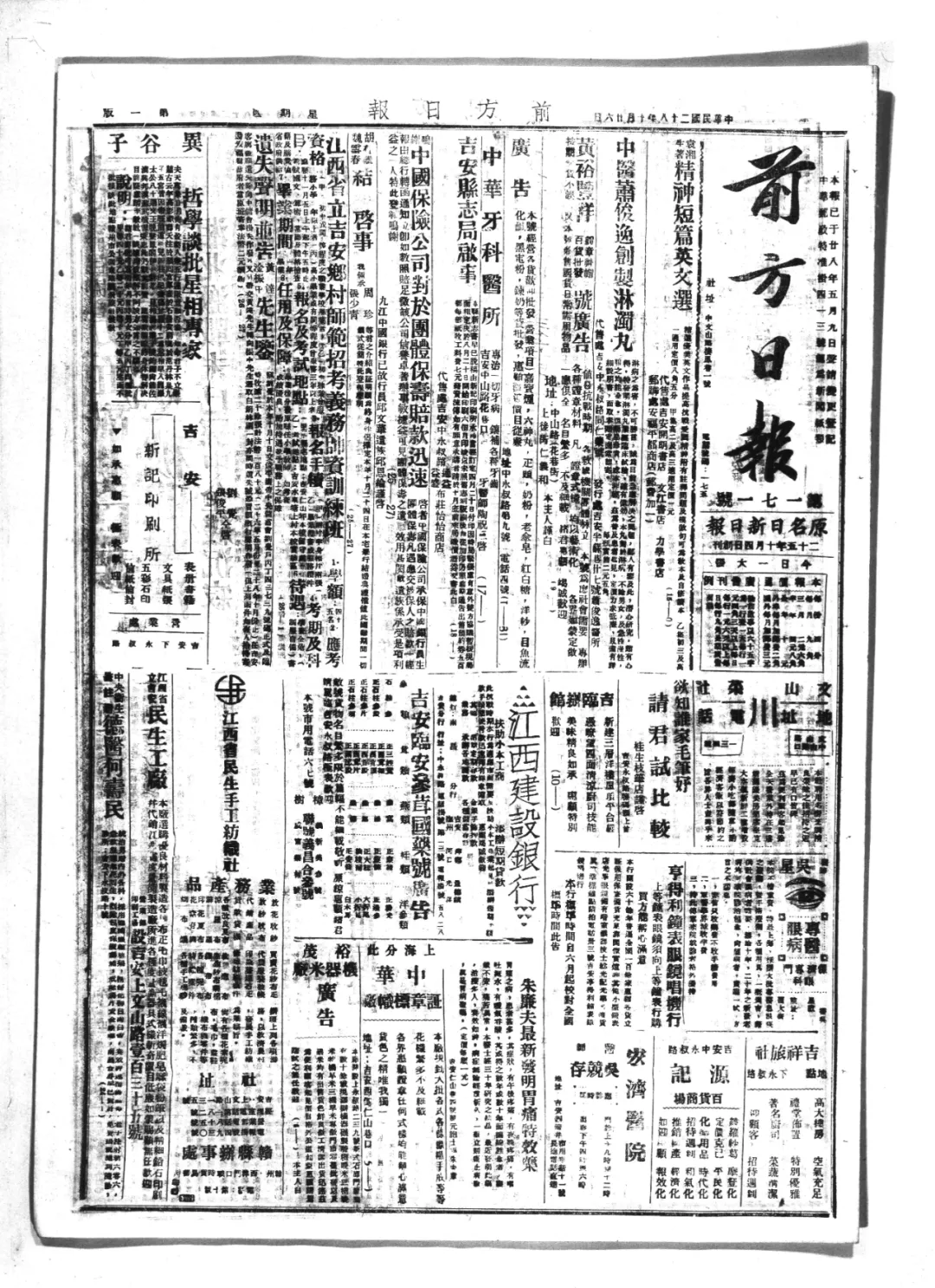 1939年3月,南昌失陷,国民党江西省政府及大批机关撤向吉安,吉安成为全省抗日救亡宣传的中心。1939年5月9日,王造时在江西省吉安创办《前方日报》,聘请刘九峰、何序东、彭文应等担任主笔,报纸的总方向为加强团结、反对内战、一致抗日。《前方日报》的社址设在吉安城内栖凤巷,编辑部及印刷厂为了避免敌机的轰炸,设在离城有六七华里的青塘。《前方日报》的前身是《日新日报》,社长为刘章甫,由于缺乏经费及人才,难以支撑,由王造时接办。《前方日报》1939年10月26日...